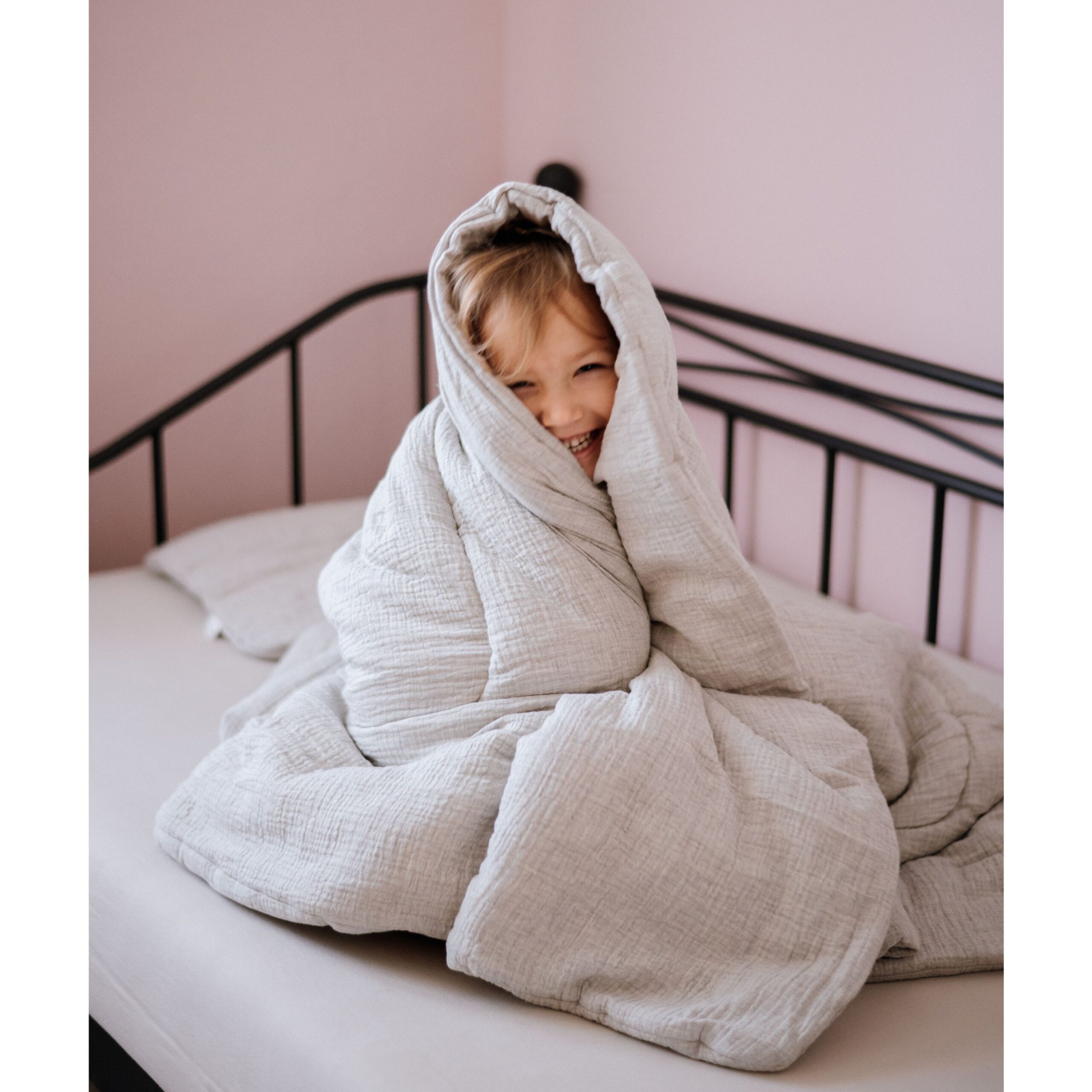Pościel z muślinu melanżowego doskonale sprawdzi się w łóżeczku niemowlęcym, w łóżku starszego dziecka oraz podczas drzemek w ciągu dnia.